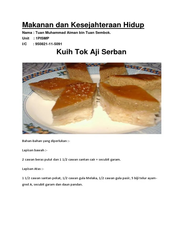 Resepi kuih tok aji serban kuih tradisional pantai timur terengganu dan kelantan bahan bahan lapisan bawah 2 cawan beras pulut 1 12 cawan santan cair secubit garam lapisan atas 1 12 cawan santan pekat 12 cawan gula melaka 12 cawan gula pasir kalau nak lebih manis boleh lebihkan 5 biji telur gred a secubit garam daun pandan. Resepi asli tok aji serban tak letak gandum pun cuma kena seimbang dgn telur santan air gula melaka ajer. Cuba akak tanya org tua2 kat trg tu yg tahu buat kuih traditional lah.